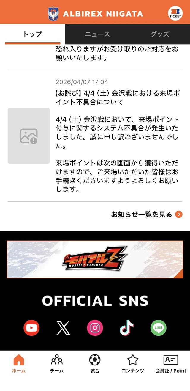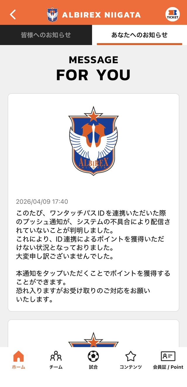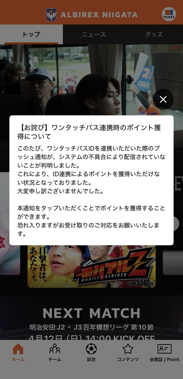 このたび、アルビレックス新潟公式アプリにおきまして、システムの不具合により「JリーグIDにワンタッチパスIDを連携いただいた際のプッシュ通知が配信されていなかった」ことが判明しました。