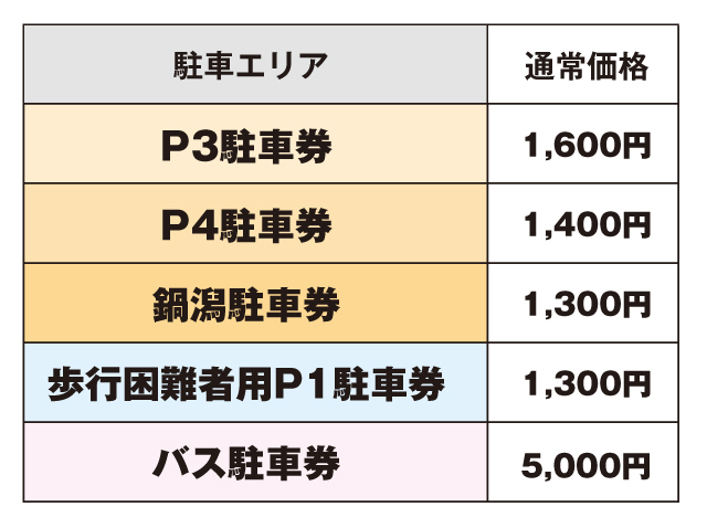 シーズンパス、年間駐車券、お誘いチケットは対象外となります。