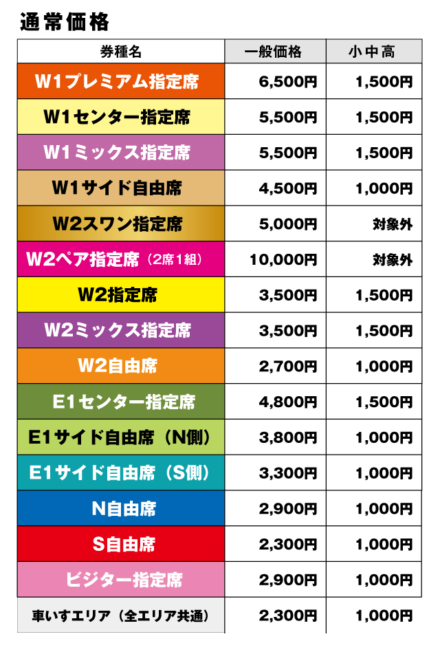 ※座席不使用の未就学児童は入場無料です。指定席・自由席に関わらず、保護者のお膝の上でご観戦ください。座席が必要な場合は、小中高生料金でご購入ください。