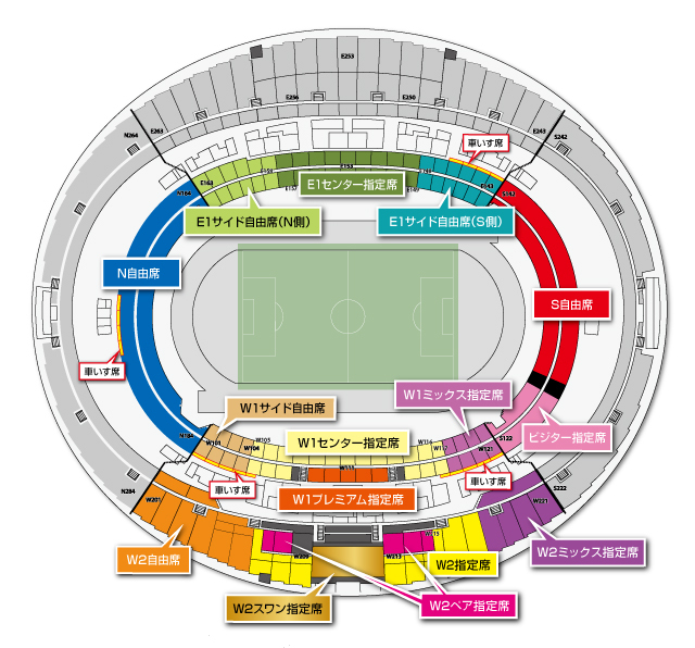※「W1ミックス指定席」と「W2ミックス指定席」は、ホーム、ビジターサポーター共に応援グッズの着用ができるエリアとして販売いたします。