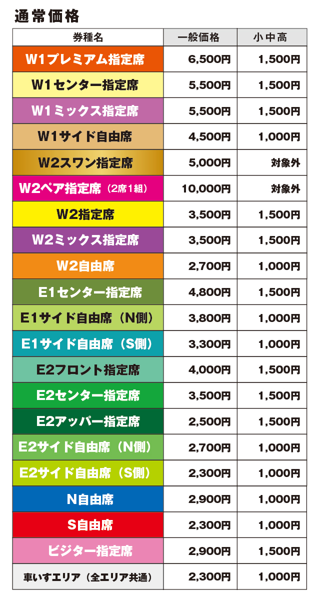 ※座席不使用の未就学児童は入場無料です。指定席・自由席に関わらず、保護者のお膝の上でご観戦ください。座席が必要な場合は、小中高生料金でご購入ください。